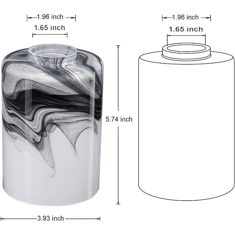 Distinctive Art Glass Designs: The small art glass cylinder shade, crafted from handblown glass, will exhibit variations in color and pattern due to its artisanal production. Opting for our art glass shade will enhance the elegance of your home. Cylinder Glass Shade Measurements: The dimensions of the glass cover are as follows: Height: 5.74 inches (14 cm); Diameter: 3.93 inches; and Fitter opening: 1.65 inches. NOTE: Please verify the dimensions of the replacement shade to ensure it fits your light fixtures before making a purchase.